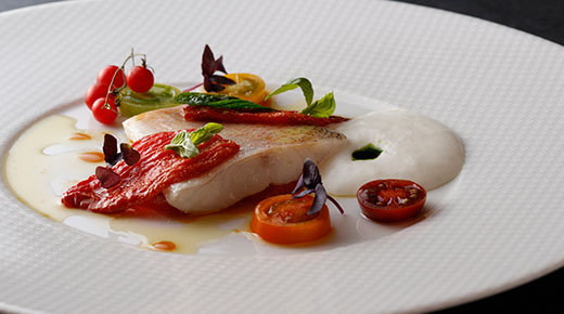スタイルで味わっていただく一品です。白皮はふっくらと蒸し焼きにし、トマトフォンデュと