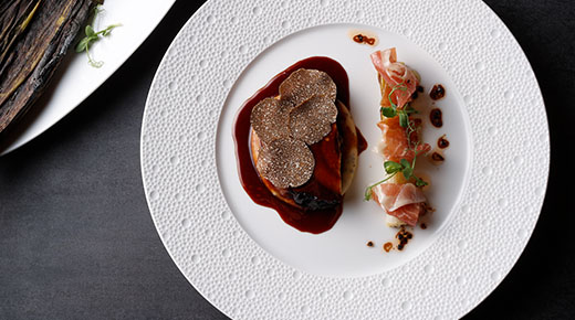 グリルし甘みを増した下仁田ねぎの芯、生ハムやトリュフの香りが野趣ある猪肉の味覚を引き立てます。