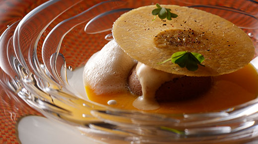 個性豊かな素材と贅沢に組み合わせました。仕上げにスパイス香るエスプーマと飴のチュイルを飾り、