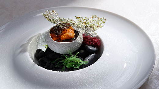 香ばしく焼いた生海苔のチュイルが食感のアクセントとなり、旨味の余韻がなめらかに広がります。