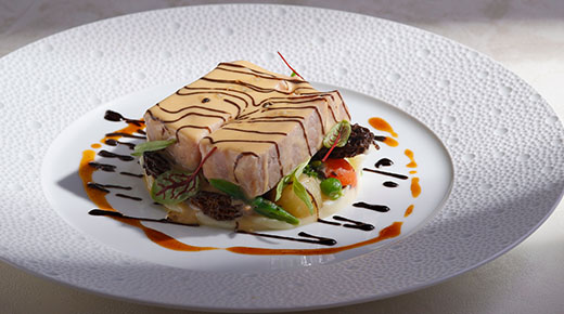 フォワ・グラのテリーヌに、濃厚な汐うにと北海道産の生うにを重ねた濃厚な味わいの前菜。